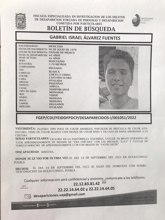 De acuerdo con la ficha de búsqueda de la Fiscalía Especializada en Investigación de los Delitos de Desaparición Forzada de Personas y Desaparición Cometida por Particulares de Puebla, a Gabriel se le vio por última vez en el municipio de Huejotzingo.