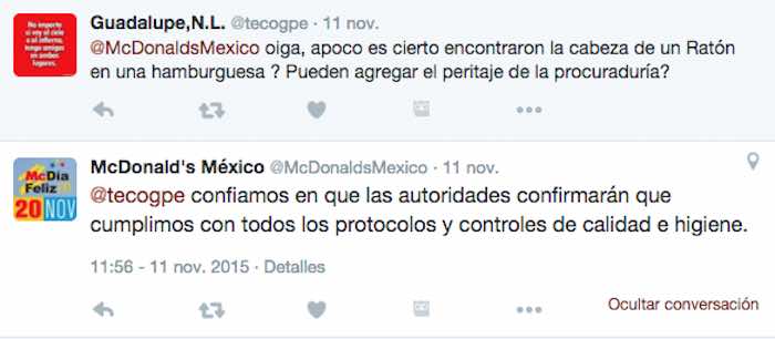 Por su parte, el restaurante, publicó en su cuenta de Twitter [@McDonaldsMexico] en respuesta de diversos señalamientos y cuestionamientos de usuarios y de medios que ya habían hecho un investigación y que habían determinado que los hechos eran falsos.