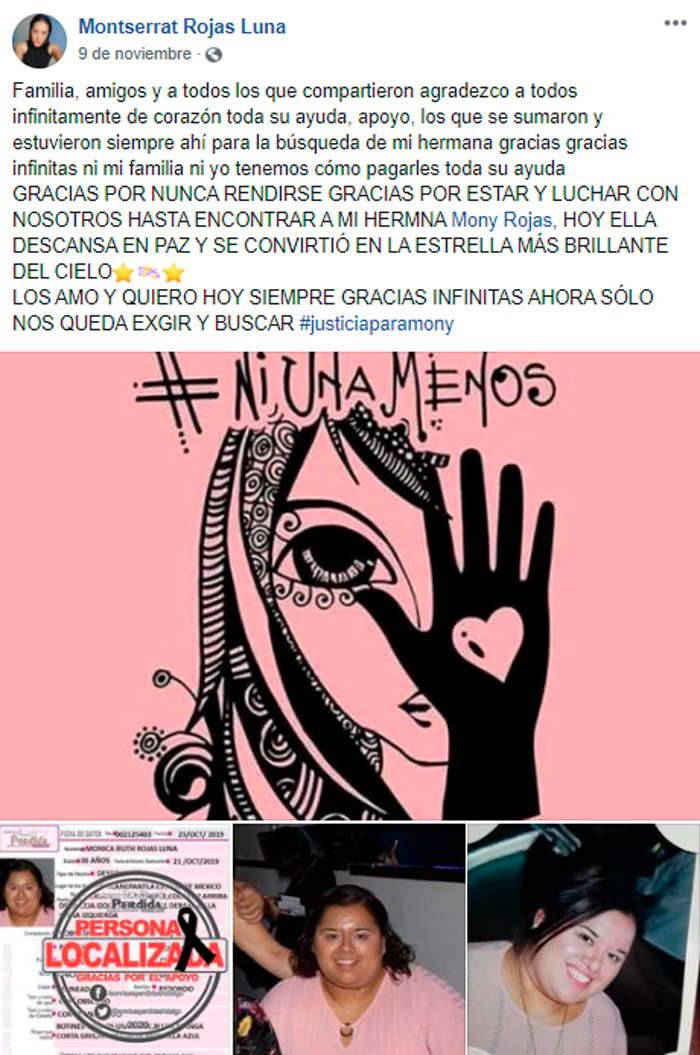 “Gracias por nunca rendirse gracias por estar y luchar con nosotros hasta encontrar a mi hermana Mony Rojas, ella hoy descansa en paz y se convirtió en la estrella más brillante del cielo”, público en sus redes sociales Monserrat Rojas Luna.