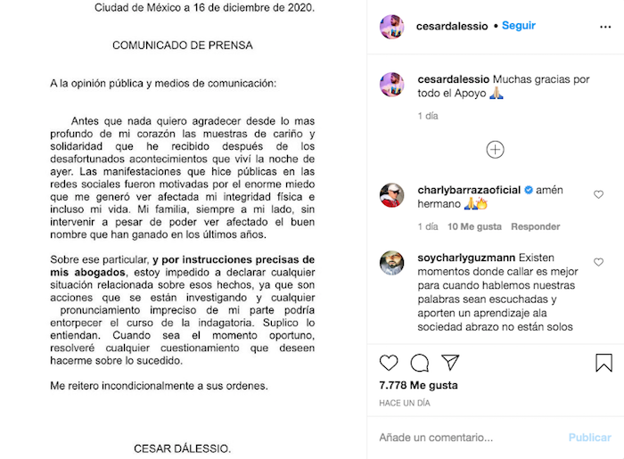 “Respecto a las imputaciones que se han vertido en contra de mi familia, quisiera aclarar que los hechos sucedidos en la madrugada de este miércoles del año en turno en mi domicilio particular no son como los declara el músico César D´Alessio en redes sociales, rechazo categóricamente los falsos señalamientos en mi contra”, se lee.