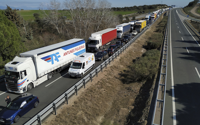 Se forman columnas de vehículos en la autopista cuando agricultores bloquean el acceso cerca de Navalmoral de la Mata, provincia de Cáceres, España, martes 18 de febrero de 2020. Foto: AP Foto, Alicia Leon.