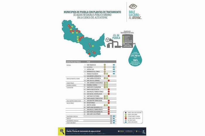 Dale la Cara al Río reveló que los municipios de Amozoc, Cuautlancingo, Coronango, San Pedro y San Andrés Cholula no cuentan con plantas tratadoras pese a que sus aguas residuales afectan el afluente del Atoyac, sin embargo, las demarcaciones sí cobran por el saneamiento pese a que no dan ese servicio.