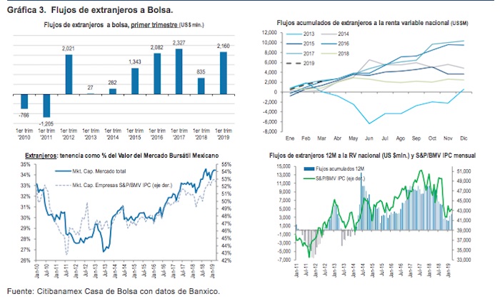 En el primer trimestre de 2019 los extranjeros invirtieron en el mercado bursátil mexicano flujos adicionales por 2 mil 160 millones de dólares, representando el segundo mejor primer trimestre desde que Citibanamex tiene registro, en 2010. La cifra sólo fue superada por los 2 mil 327 millones de dólares que se reportaron en el primer trimestre de 2017.