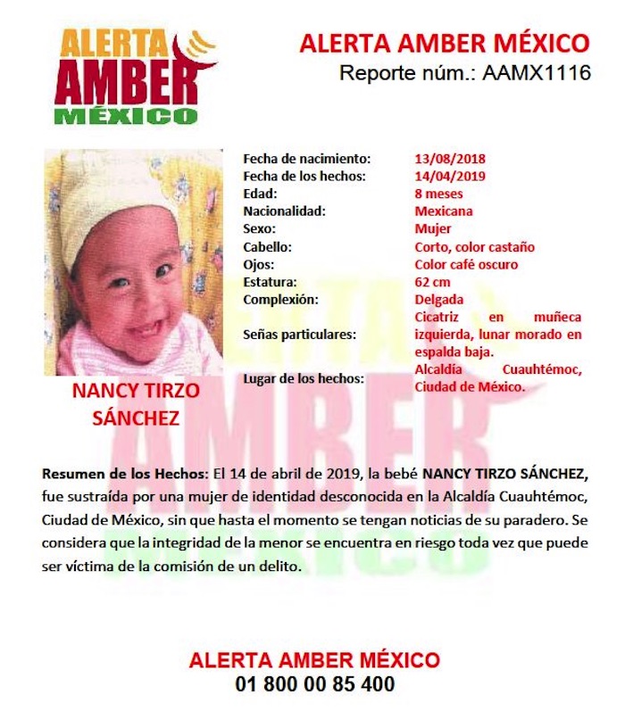 El domingo pasado una mujer raptó a Nancy Tirzo Sánchez, de 8 meses de edad, en las inmediaciones del Hospital General de México, en la colonia Doctores.