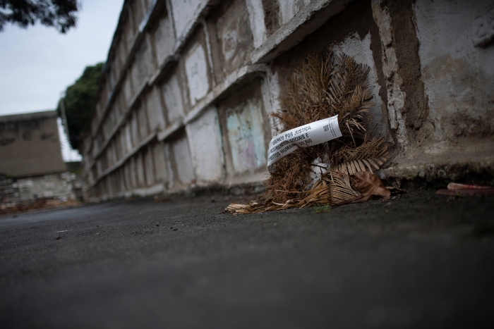 "Nuestras condolencias. Lucharemos por justicia. Con solidaridad, de los movimientos sociales y organizaciones de derechos humanos de Río", adorna la tumba de João Pedro Matos Pinto en el cementerio de Sao Miguel, en Sao Goncalo, Brasil. Foto: AP.