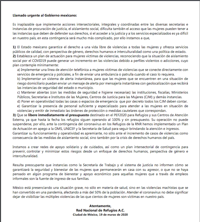 La Red Nacional de Refugios señaló al Gobierno mexicano que esta situación es inaplazable y que deben de implementarse acciones intersectoriales, integrales y coordinadas entre las instancias gubernamentales para garantizar una vida libre de violencia a todas las mujeres, niñas, niños y adolescentes.