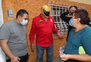 El luchador Tinieblas, candidato a la alcaldía de Venustiano Carranza por el partido Redes Sociales Progresistas (RSP), habla con la ciudadanía. Foto: Mario Guzmán, EFE.
