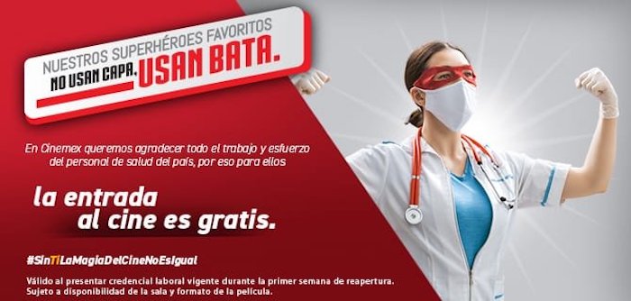 Ciudad de México, 19 junio (SinEmbargo).- Tras haber difundido las medidas sanitarias para el regreso a la nueva normalidad, Cinemex compartió una promoción con la que busca reconocer a los verdaderos héroes de esta pandemia: el personal médico.