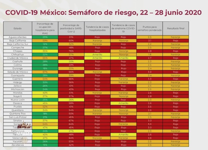 Baja California, Chiapas, Ciudad de México, Estado de México, Guerrero, Morelos, Nayarit, Oaxaca, Puebla, Querétaro, Sinaloa, Sonora, Tabasco, Tlaxcala y Veracruz son las que se mantienen en Semáforo Rojo.