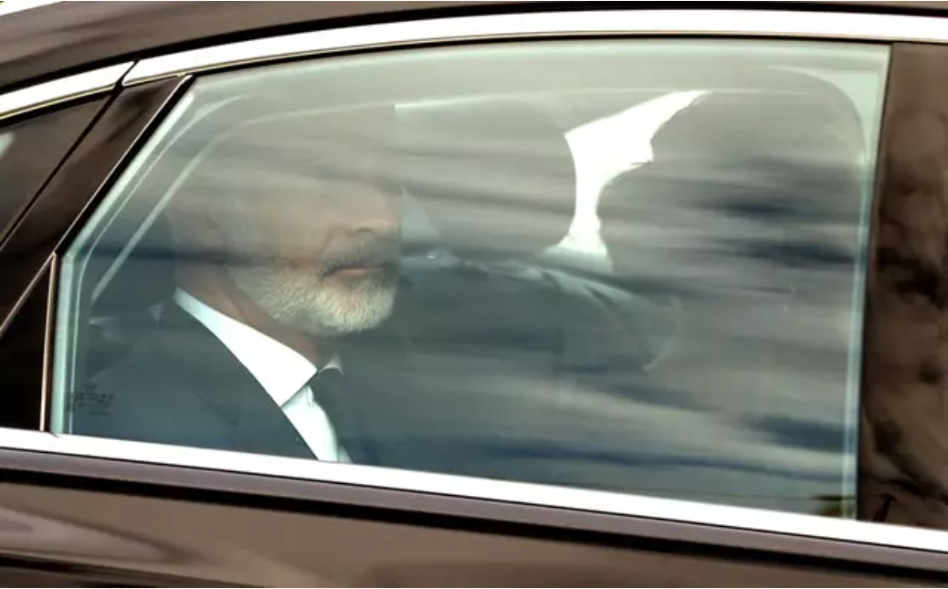 El que fuera monarca llegó caminando con dificultad, apoyado en un bastón y en un ayudante. Felipe VI y la reina Letizia llegaron más tarde, ya que previamente habían acudido a la capilla ardiente de Isabel II en Westminster Hall.