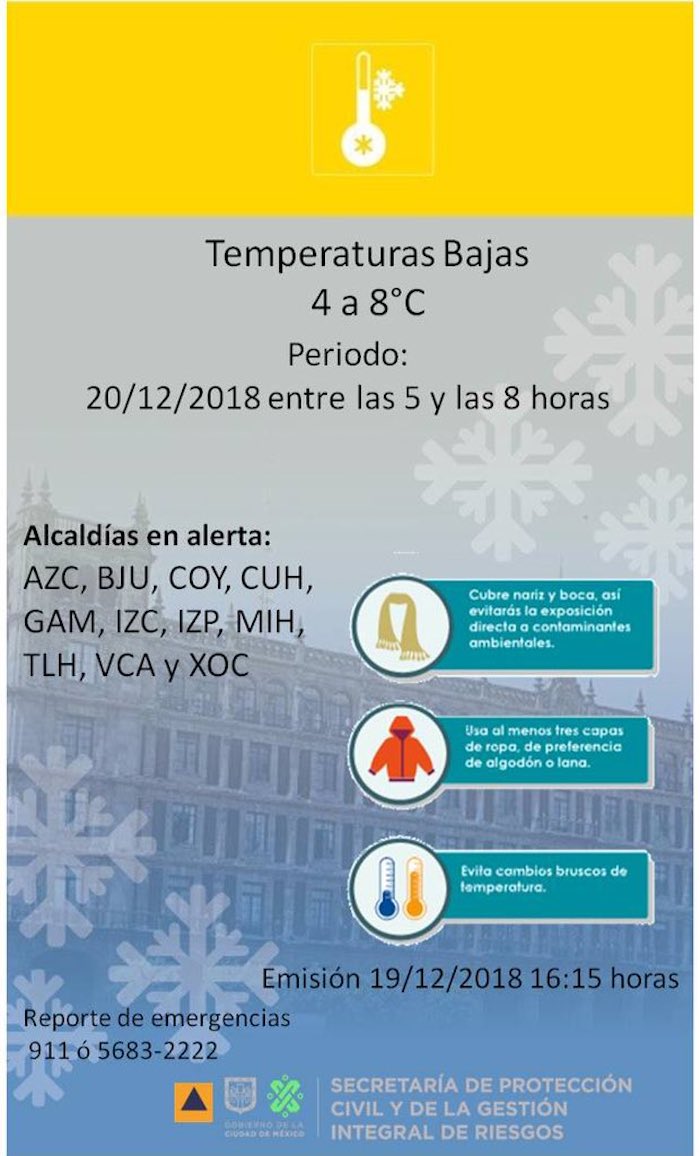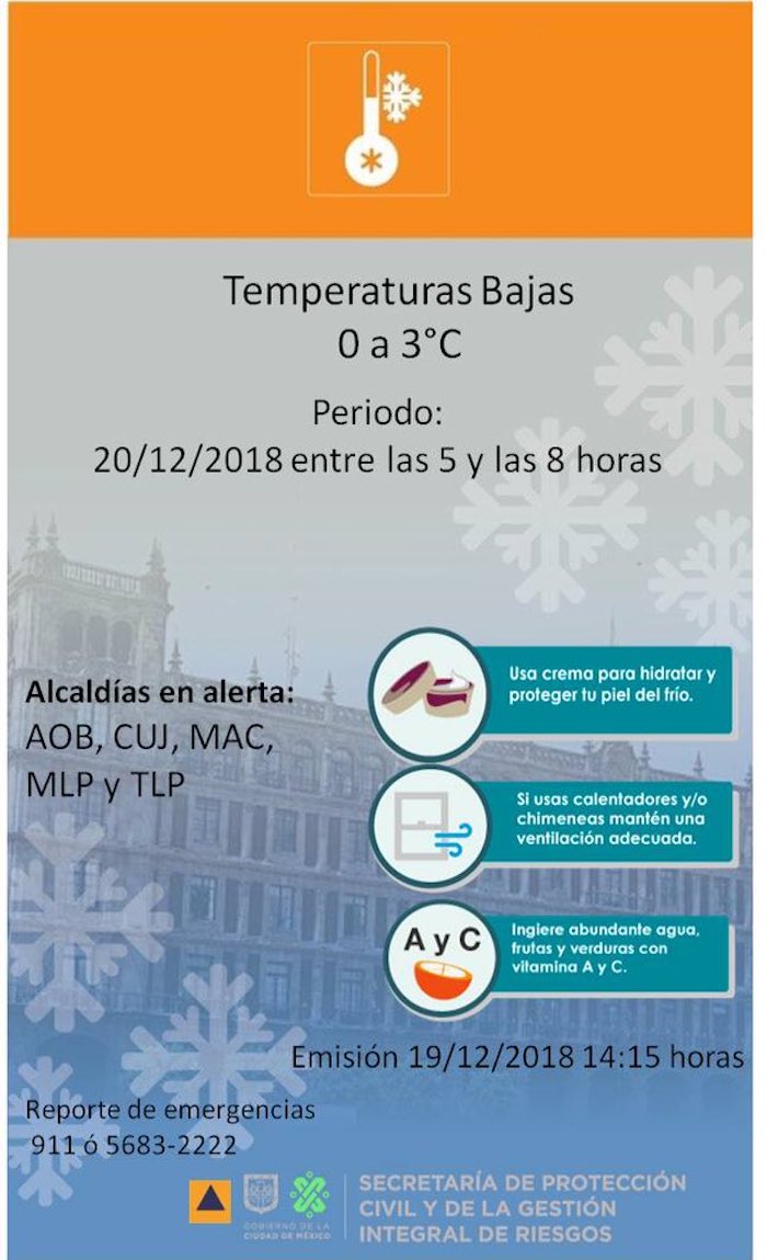 Informó que se activó, también para este jueves 20, la alerta naranja por pronóstico de temperaturas bajas previas al amanecer en las alcaldías de Álvaro Obregón, Cuajimalpa, Magdalena Contreras, Milpa Alta y Tlalpan.