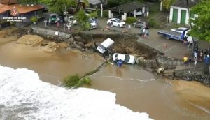 Esta imagen proporcionada por el Gobierno de Sao Paulo muestra vehículos de caídos de una zona desmoronada junto a la playa en Sao Sebastiao, al este de Sao Paulo, Brasil, el domingo 19 de febrero de 2023, tras una fuerte tormenta en la zona. Foto: Gobierno de Sao Paulo via AP.