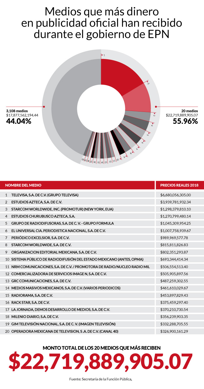 Además, destaca, del total del gasto pagado de enero de 2013 hasta diciembre de 2017 [que asciende a 40 mil 597 millones de pesos], el 55.96 por ciento fue destinado únicamente a 20 medios de comunicación (más de 20 mil millones) y el 44.04 por ciento restante a un total de 3 mil 108 medios de comunicación.