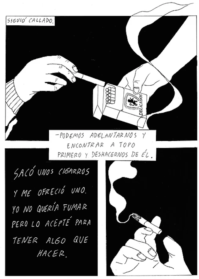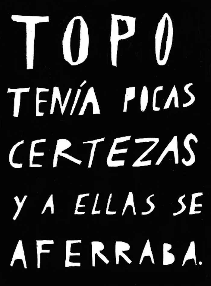 Los personajes están delimitados con apenas unas pocas y potentes frases. El texto, al igual que el dibujo, logra construir emociones complejas con el uso del contraste y las formas simples.