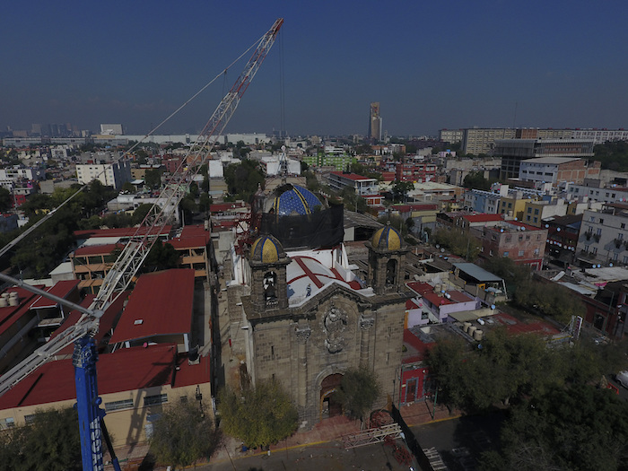 Mondragón aprendió a respetar la vieja iglesia, construida en el sitio que ocupó una capilla de fines del 1500, de la que queda solo una porción de los muros. La cúpula fue construida entre 1740 y 1884. El arquitecto dice que la iglesia es “noble”. La cúpula no cayó durante el temblor sino cinco días después, dando tiempo a que saliese la gente y se sacasen los objetos preciosos.