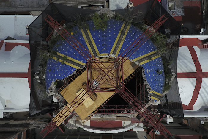Esto no quiere decir que el trabajo sea primitivo. En la iglesia Nuestra Señora de los Ángeles, cerca del centro de la capital, las obras de restauración parecen una escena de la era espacial: Imponentes estructuras metálicas de soporte son bajadas delicadamente por enormes grúas para sostener la cúpula de la iglesia, la mitad de la cual se derrumbó. La otra mitad del domo de 100 toneladas que permanece en su lugar está 25 metros (80 pies) arriba de los trabajadores.