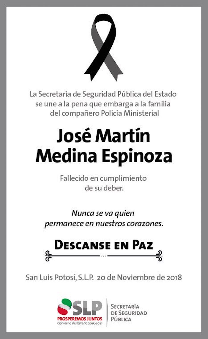 José Martín Mediana Espinoza murió en el cumplimiento de su deber, informaron autoridades de San Luis Potosí.