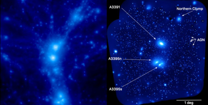 La imagen muestra la distribución de gas caliente (izquierda), en comparación con la imagen de rayos X eROSITA del sistema Abell 3391/95 (derecha). Foto: Astronomy & Astrophysics