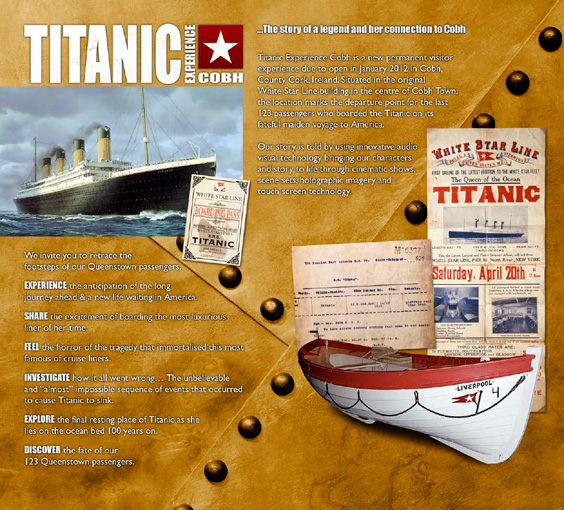 9. La Experiencia Titanic Cobh es una nueva exposición turística permanente que abrió sus puertas en enero de 2012 en Cobh, en el condado de Cork.La exposición está situada en el edificio original de la naviera White Star Line en Cobh, lugar en el que también embarcaron los últimos 123 pasajeros del Titanic. El edificio refleja la gran intensidad emocional de la historia que se cuenta y Cobh , última escala de la grandiosa y desafortunada nave, se ha convertido en hogar natural para la Experiencia Titanic.El objetivo de esta puesta es el de recrear la experiencia a bordo del barco y compartir las alegrías y las penas de un transatlántico de principios del siglo XX por medio de ingeniosos diseños, ayudas audiovisuales y muestras interactivas. Entre estos se incluyen presentaciones cinematográficas, imágenes holográficas y tecnología de pantallas táctiles.
