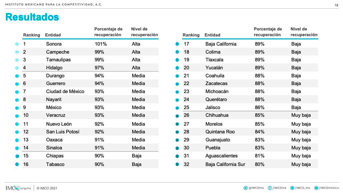 El Instituto Mexicano para la Competitividad (IMCO) informó que el estado presentó una recuperación económica alta durante el último trimestre del 2020.