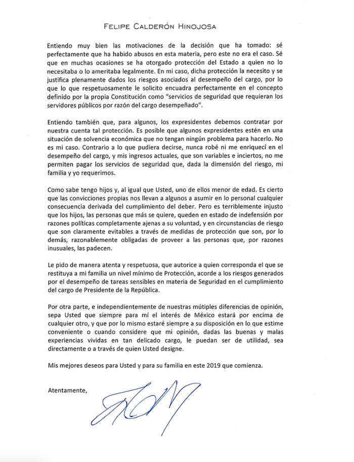 En la misiva, el ex Presidente Felipe Calderón Hinojosa explicó que con la decisión del nuevo Gobierno federal, de retirar toda la protección que les brindaba el Estado Mayor Presidencial, él y su familia quedaron desprotegidos.