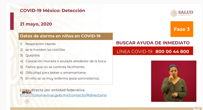 La funcionaria expuso que los datos de alarma para identificar posibles casos de COVID-19 en la niñez son la respiración rápida, el hundimiento de las costillas, quejidos, coloración morada o azulada alrededor de la boca, fibre que no se controla fácilmente, dificultad para beber o amamantarse y si el niño o la niña se ven muy enfermos o somnolientos.