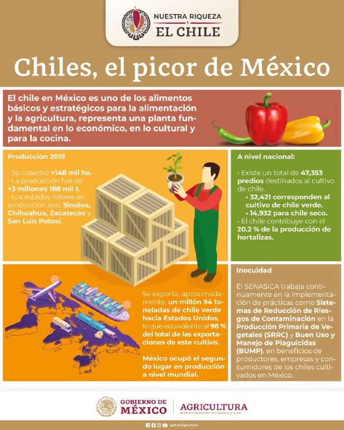 Además de su gran lugar en la cocina, el chile representa para el país parte fundamental en lo económico y cultural. Los estados lideres en su producción son Sinaloa, Chihuahua, Zacatecas y San Luis Potosí.