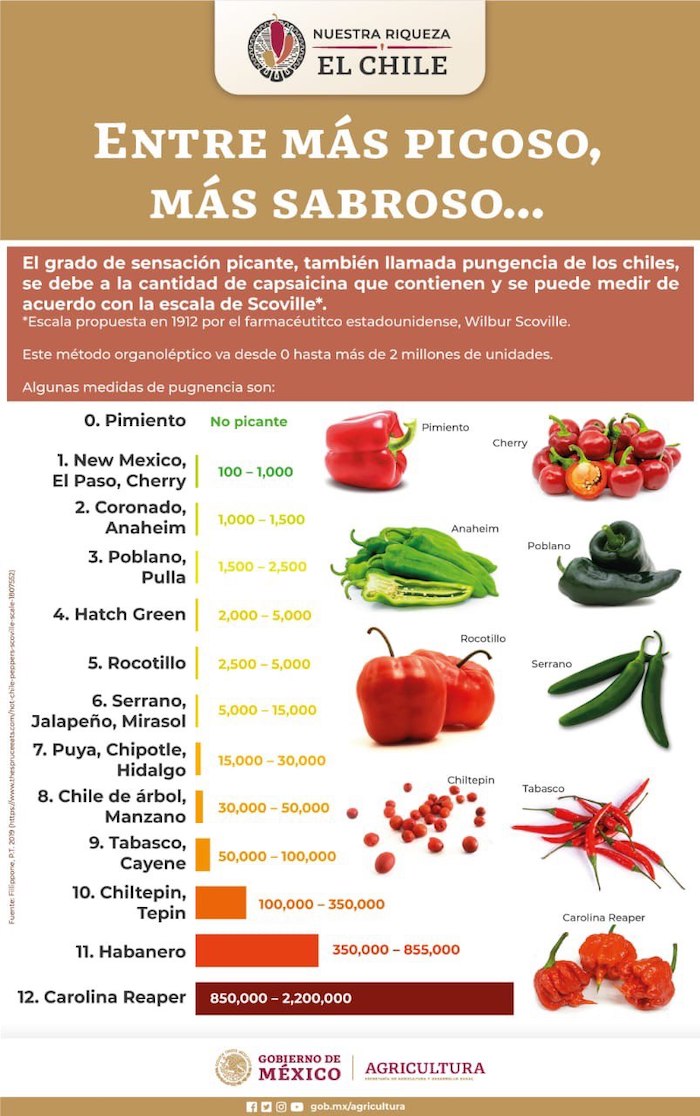 El Secretario de Agricultura y Desarrollo Rural, Víctor Villalobos Arámbula, indicó que hay un registro de 29 tipos de chile cultivados. Sin embargo, hay cuatro variedades las que contribuyen con el 77.9 por ciento del volumen de producción nacional: chile jalapeño, que aporta el 31.2 por ciento; seguido de morrón, con 21.7 por ciento; poblano, con 13.7 por ciento, y serrano, con 11.3 por ciento.
