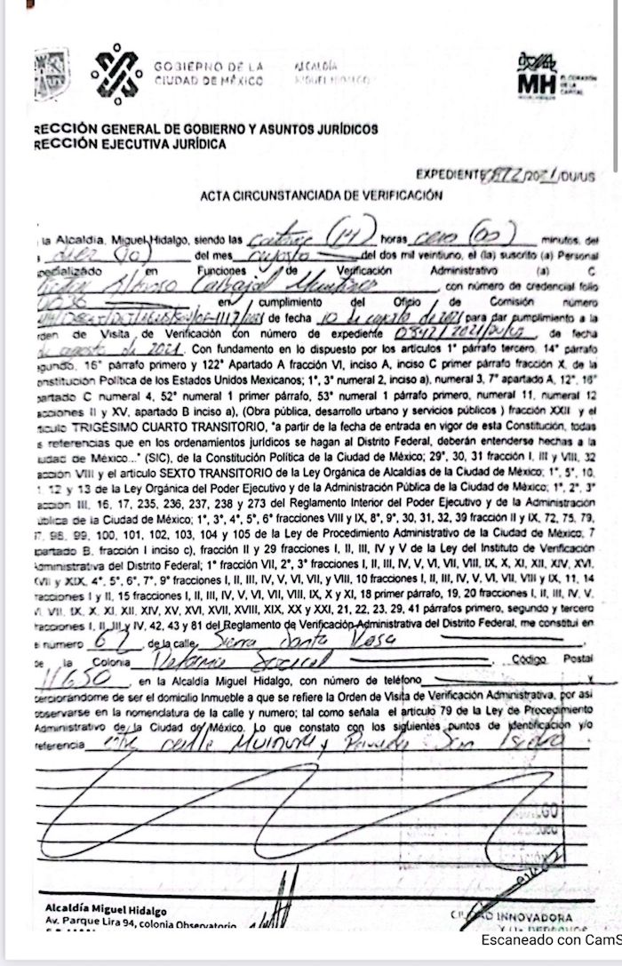 De acuerdo con un documento de la Dirección General de Gobierno y Asuntos Jurídicos, con fecha del 10 de agosto de 2021, se realizó la visita de verificación a Sierra Santa Rosa 62 y la resolución de las anomalías, por temporalidad, correspondería al equipo entrante.