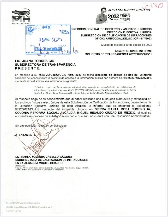 Sin embargo, su propia administración admite que hasta este año no han atendido el caso: de acuerdo con la solicitud 092074823002351 dirigida a la Alcaldía Miguel Hidalgo y que ésta responde el 30 de agosto de 2023, la Subdirección de Calificaciones de Infracciones confirma que el inmueble ubicado en Sierra Santa Rosa 62 aún “se encuentra en proceso de substanciación por lo que aún no se cuenta con una resolución administrativa”.