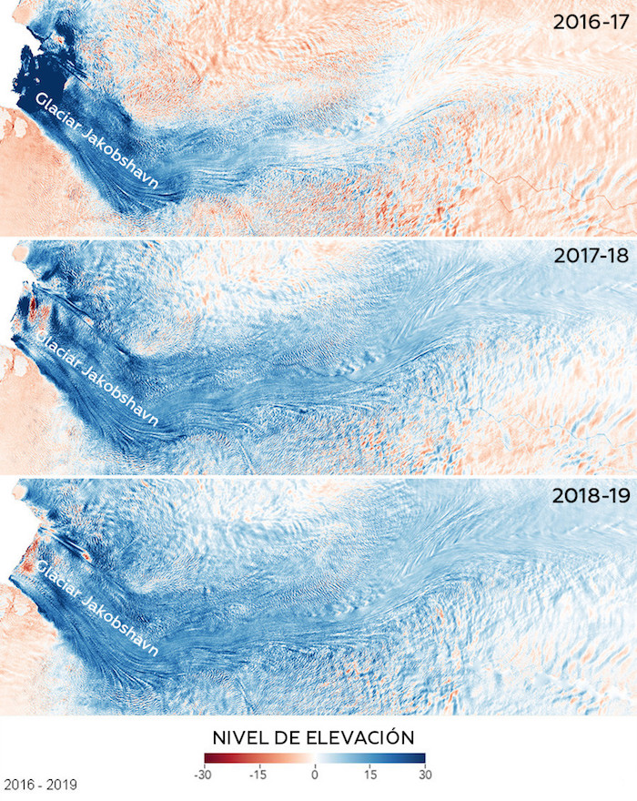 Las áreas azules representan allí las zonas donde la altura del glaciar ha aumentado (en algunas partes hasta 30 metros por año). El cambio fue particularmente llamativo en la parte frontal del Jakobshavn entre 2016 y 2017.
