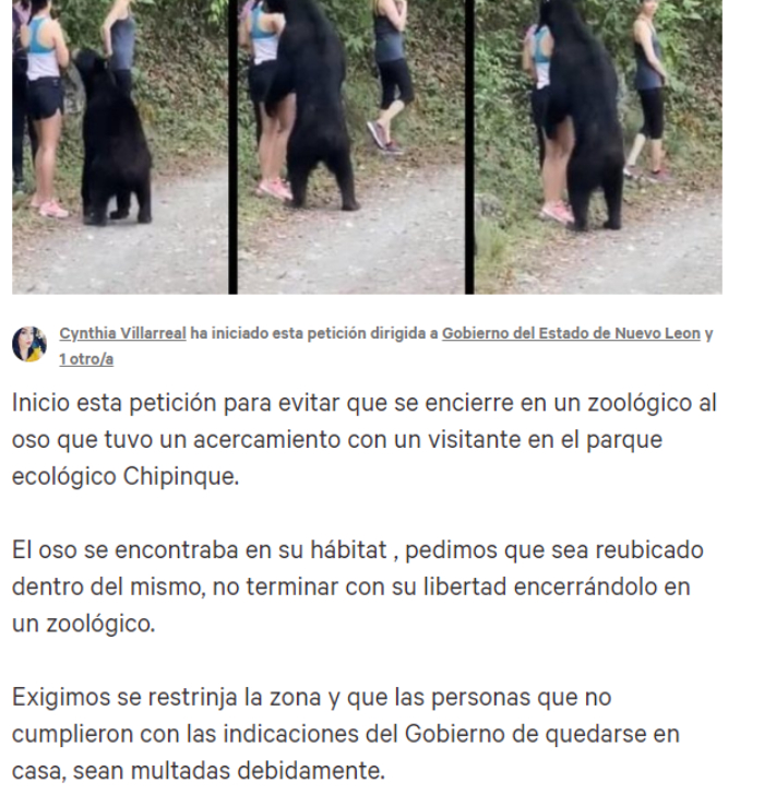 "Inicio esta petición para evitar que se encierre en un zoológico al oso que tuvo un acercamiento con un visitante en el parque ecológico Chipinque", escribió en la plataforma.
