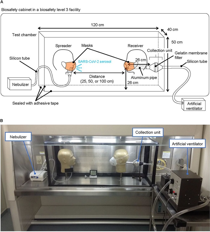La prueba se realizó con un simulador de infección del virus SARS-CoV-2 usando dos cabezas de maniquíes colocadas frente a frente dentro de una vitrina, una de ellas con un nebulizador descargando el virus y la otra dotada de un ventilador imitando la respiración humana.
