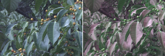 Para las aves, los lados superiores de las hojas aparecen mucho más claros en el ultravioleta. Desde abajo, las hojas son muy oscuras. De esta manera, la estructura tridimensional del follaje denso es obvia para las aves. Esto a su vez hace que sea fácil para ellos moverse, encontrar comida y navegar. Las personas, por otro lado, no perciben los rayos ultravioleta, y ven el follaje en verde, el color con el peor contraste.
