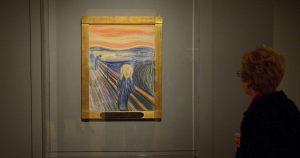 La pintura, que muestra una figura esquelética llevándose las manos a la cabeza con la boca abierta, se ha convertido en un ícono mundial de la ansiedad humana. La frase, “sólo pudo haber sido pintada por un loco”, está escrita en la esquina superior izquierda.