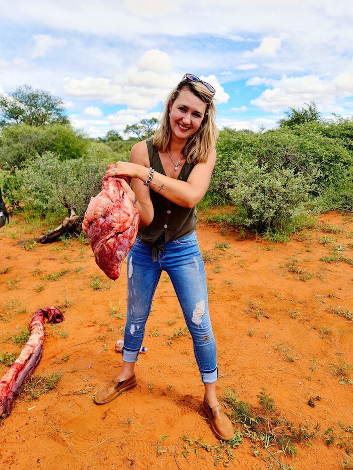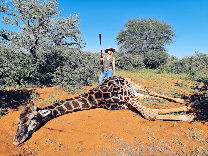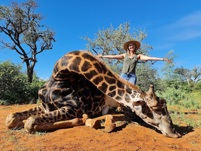 La cazadora, de 32 años, compartió en Facebook fotos en donde posa con el corazón del animal y narró que un amigo se comunicó con ella para informarle de una jirafa vieja, la cual no viviría más de tres meses.