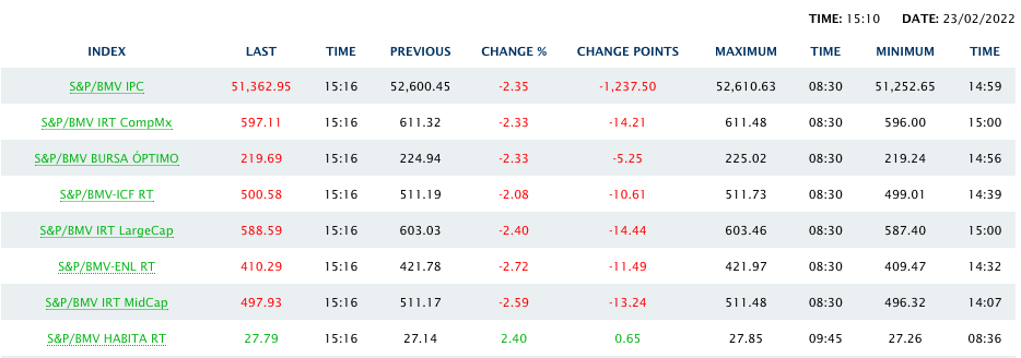 Ciudad de México, 23 de febrero (EFE).– La Bolsa Mexicana de Valores (BMV) retrocedió este miércoles un 2.35 por ciento en su principal indicador para ubicarse en 51 mil 362.95 puntos, viéndose afectada una jornada más por la situación geopolítica por el conflicto entre Ucrania y Rusia.