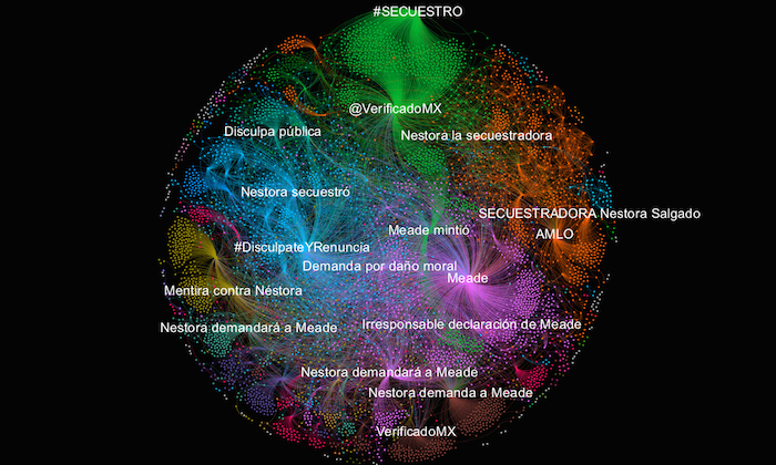 Grafo que muestra los principales temas de conversación que se generó en torno a Nestora Salgado el martes por la tarde, tras ofrecer una rueda de prensa. Foto: SinEmbargo