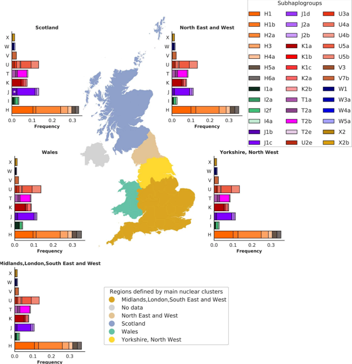 Sin embargo, los investigadores demostraron que ciertos antecedentes genéticos nucleares se asocian preferentemente con ciertos antecedentes genéticos mitocondriales, especialmente en Escocia y Gales.