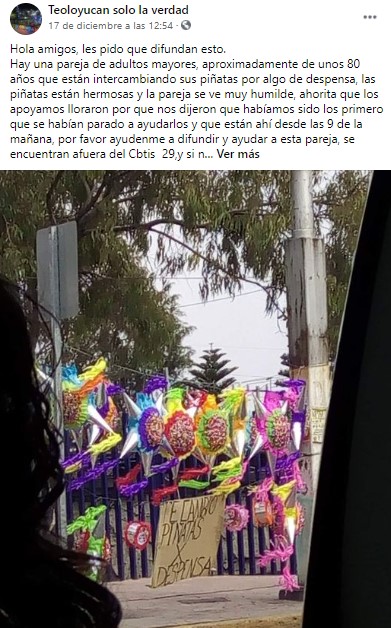 "Hay una pareja de adultos mayores, aproximadamente de unos 80 años, que están intercambiando sus piñatas por algo de despensa. Las piñatas están hermosas y la pareja se ve muy humilde. Ahorita que los apoyamos lloraron por que nos dijeron que habíamos sido los primeros que se habían parado a ayudarlos y que están ahí desde las 9:00 horas, por favor ayúdenme a difundir y ayudar a esta pareja", se lee en el post.
