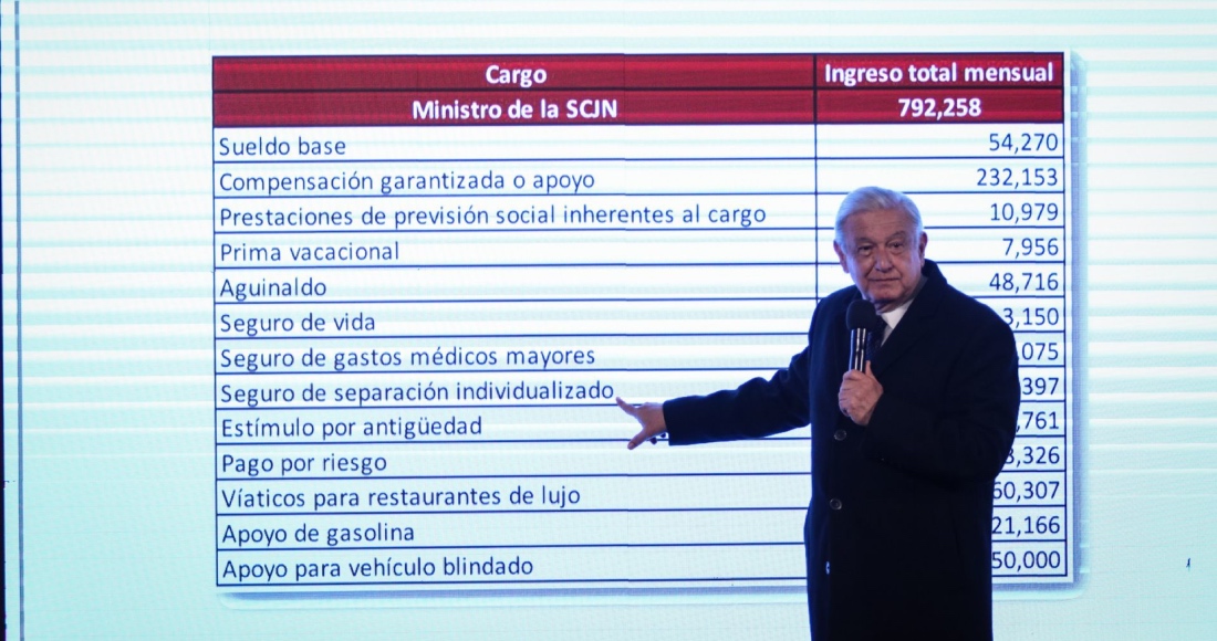 El Presidente desglosó en una tabla el sueldo mensual que reciben las y los ministros de la Suprema Corte de Justicia de la Nación (SCJN), quienes perciben casi 800 mil pesos al mes.