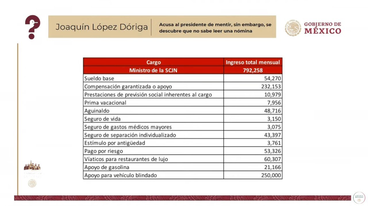 En la gráfica compartida, el ingreso total mensual de un Ministro o Ministra de la Corte es de 792 mil 258 pesos, en donde el sueldo base es de 54 mil pesos, pero existe la compensación garantizada, o el apoyo para vehículo blindado que superan los 230 mil pesos, así como otros seguros y estímulos.