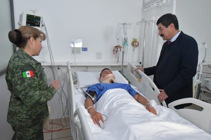 “Vine para agradecerte todo lo que haces y, sobre todo, tu ayuda a Chihuahua. Vine a verte para que le eches ganas. Qué bueno que no pasó a mayores”, dijo Corral al policía militar Raúl Misael Flores Flores, quien se recupera del accidente en el Hospital Militar.