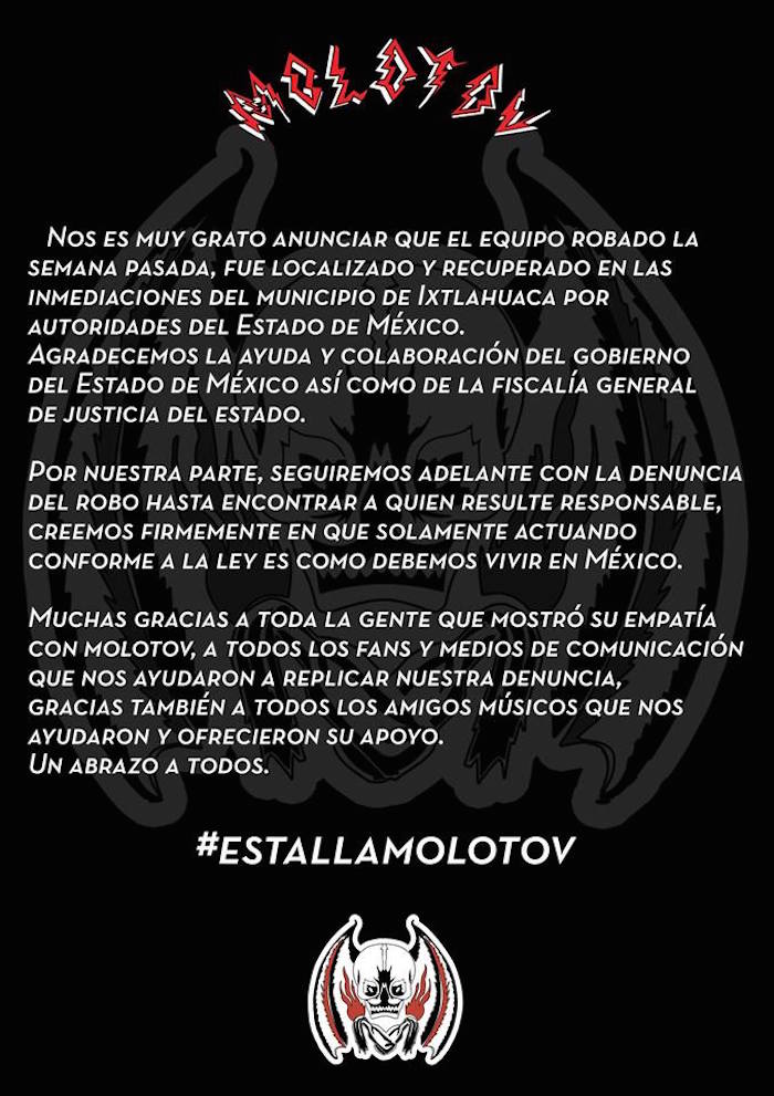 La banda publicó ayer en su cuenta de facebook la noticia y agradeció a sus amigos músicos, seguidores y medios de comunicación por difundir la noticia. Molotov continuará y seguirá colaborando con la investigación hasta dar con los responsables del robo.