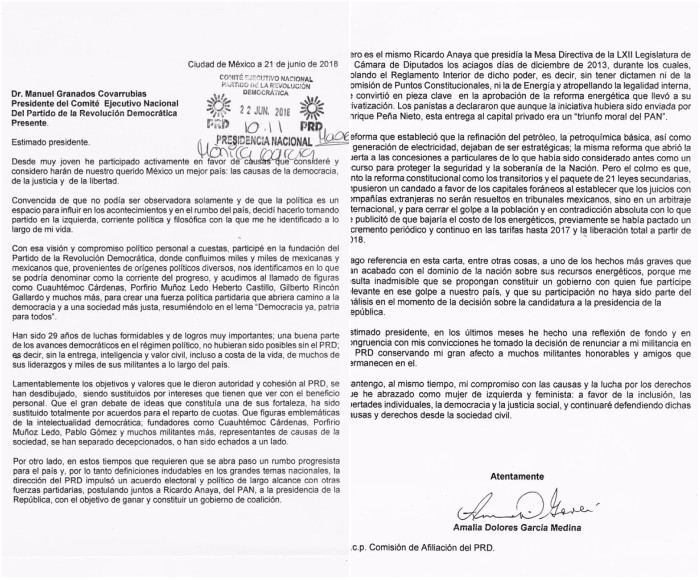 Amalia García hizo igual. En una misiva dirigida a Manuel Granados Covarrubias, dirigente del partido, la ex Gobernadora criticó la coalición del Sol Azteca con el PAN para lanzar a Ricardo Anaya como candidato. Y criticó que esta alianza se da en tiempos que se requiere “se abra paso a un rumbo progresista para el país”.