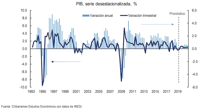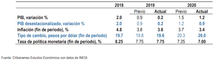 Citibanamex revisó a la baja su pronóstico no sólo para los meses que quedan de 2019, sino también para 2020, al 1.2 por ciento, del 0.9 y 1.5 por ciento, respectivamente, que plantearon con anterioridad.