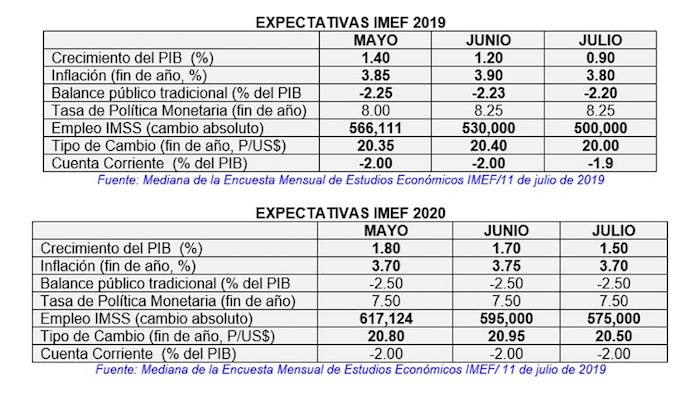 Por su parte, el IMEF presentó su reporte de perspectivas económicas de julio 2019 en el que destacó que la rápida desaceleración de la economía mexicana debido al bajo crecimiento del PIB, además de que el panorama global sí derivará en afectaciones internas.