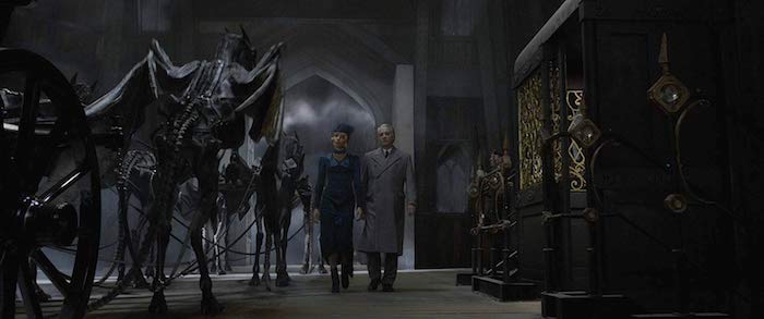 En la película, el preso Gellert Grindelwald es trasladado desde Nueva York a Europa en un carruaje que está tirado por unas extrañas criaturas negras enfundadas en cuero negro. Éstas criaturas son en realidad Thestrals, los seres que tiran de los carros de Hogwarts en La Orden del Fénix, y que tal y como revela Luna Lovegood, sólo pueden ser vistos por aquello que han presenciado la muerte.