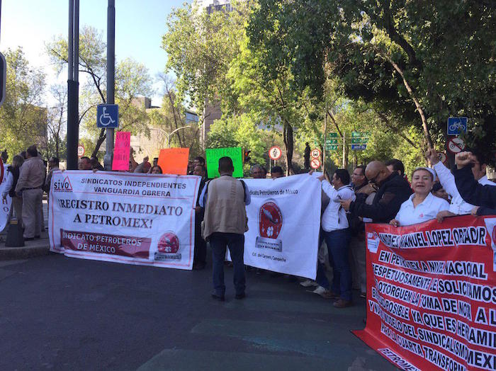 Un grupo de miembros del sindicato Petromex, alterno al del líder petrolero Carlos Romero Deschamps, bloqueó esta mañana la avenida Paseo de la Reforma frente a la Secretaría del Trabajo para exigir su toma de nota luego de ya haber cumplido con los requisitos.