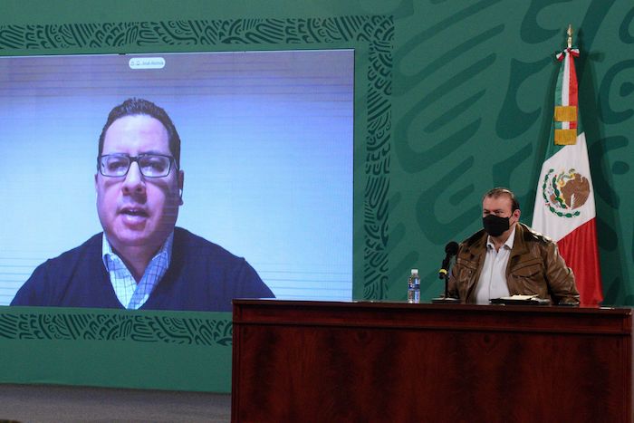 Christian Arturo Zaragoza Jiménez, director de Información Epidemiológica, y José Luis Alomía Zegarra, director general de Epidemiología, durante la conferencia de prensa para informar sobre la actualización de datos de la pandemia y el avance de la estrategia nacional de vacunación contra el coronavirus. Foto: Mario Jasso, Cuartoscuro.